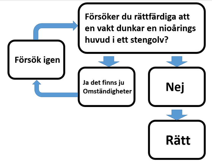Stämmer dessutom andras vittnesmål om pojkens uppförande med spottande och bitande så tycks onekligen vaktens hantering vara adekvat - men om igen - låt oss vara lite lugna med att dra solida slutsatser ur en film som uppenbart är klippt i ett flertal gånger av någon outgrundlig anledning och därför omöjligt kan visa hela bilden.